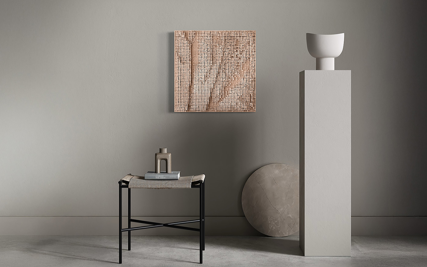 The result is a paradox: a material associated with weight and rigidity becomes the bearer of delicacy, texture, and touch.