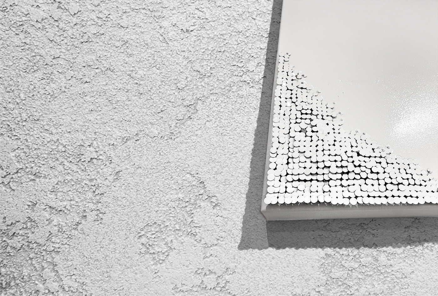 The soft coating offsets the hardness of the nails, inviting the eye to sense touch even before the hand makes contact. Minimal yet tactile, White Unicorner is both sculpture and atmosphere, embodying my ongoing dialogue with monochromaticity.