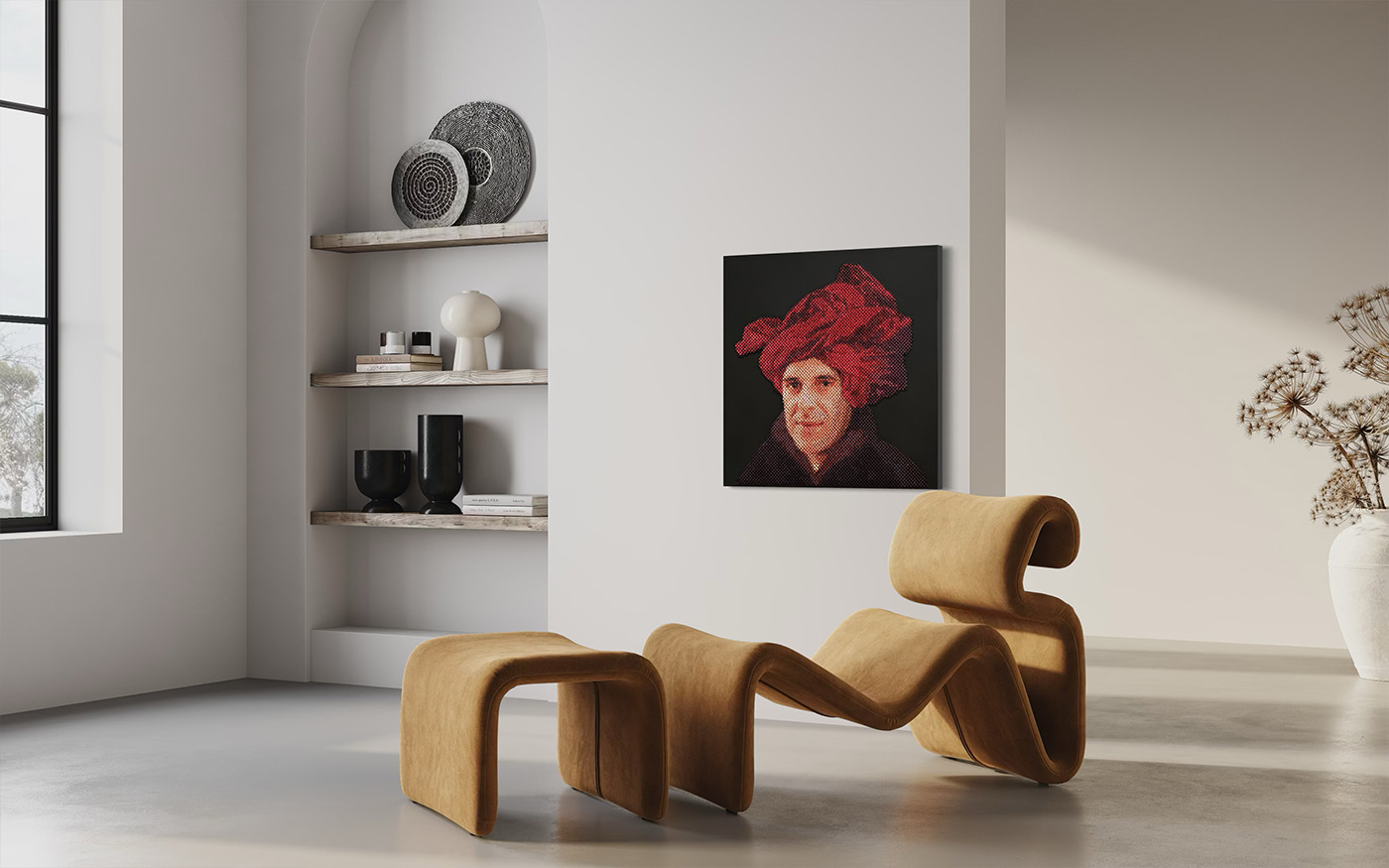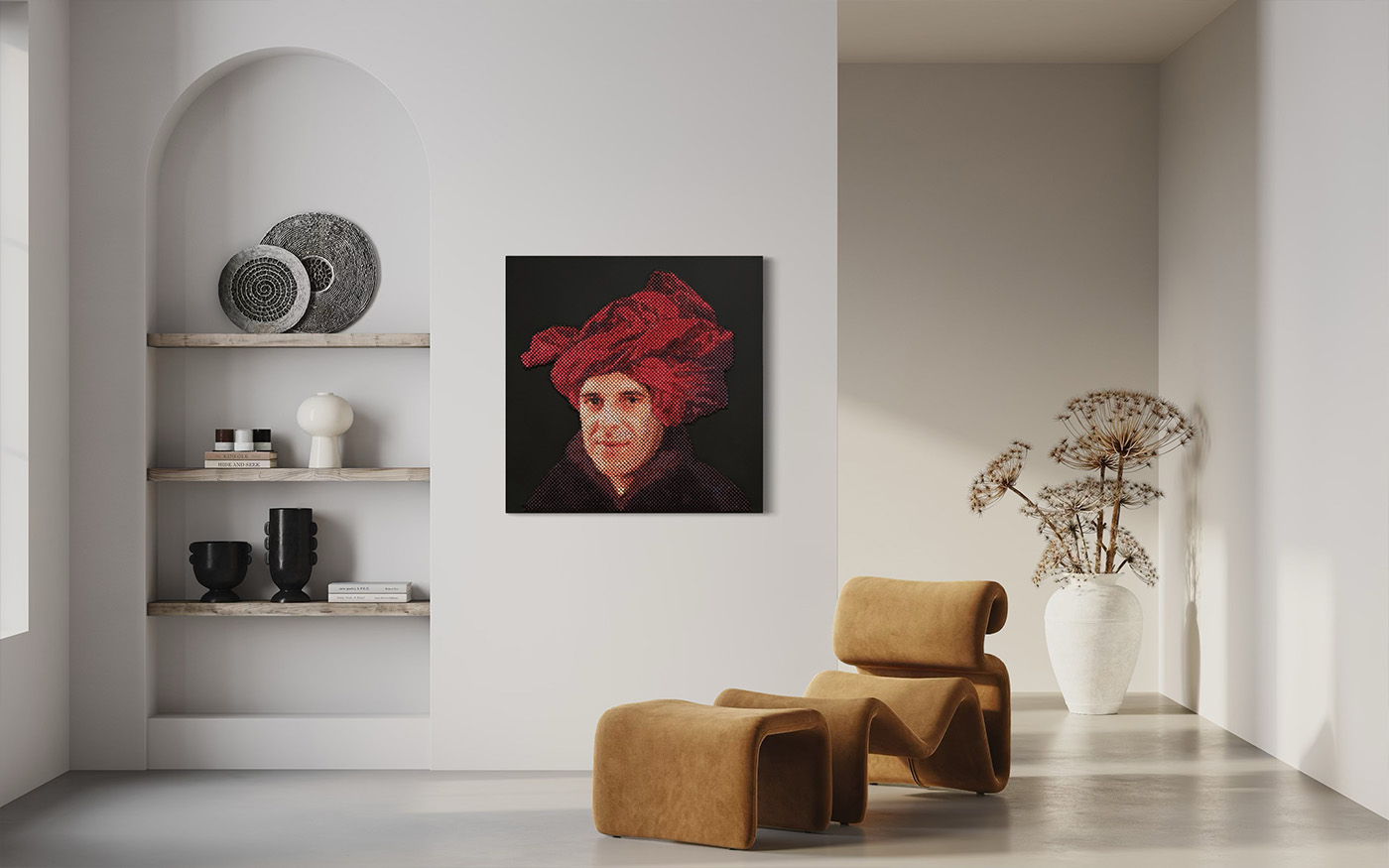 For this portrait, I drew inspiration from Jan van Eyck’s Man with a Red Turban. I replaced the sitter’s face with that of Bofill, placing him within a lineage of artistic masters. Yet beyond homage, the piece seeks to capture his nomadic spirit, his restless search for form, space, and meaning.