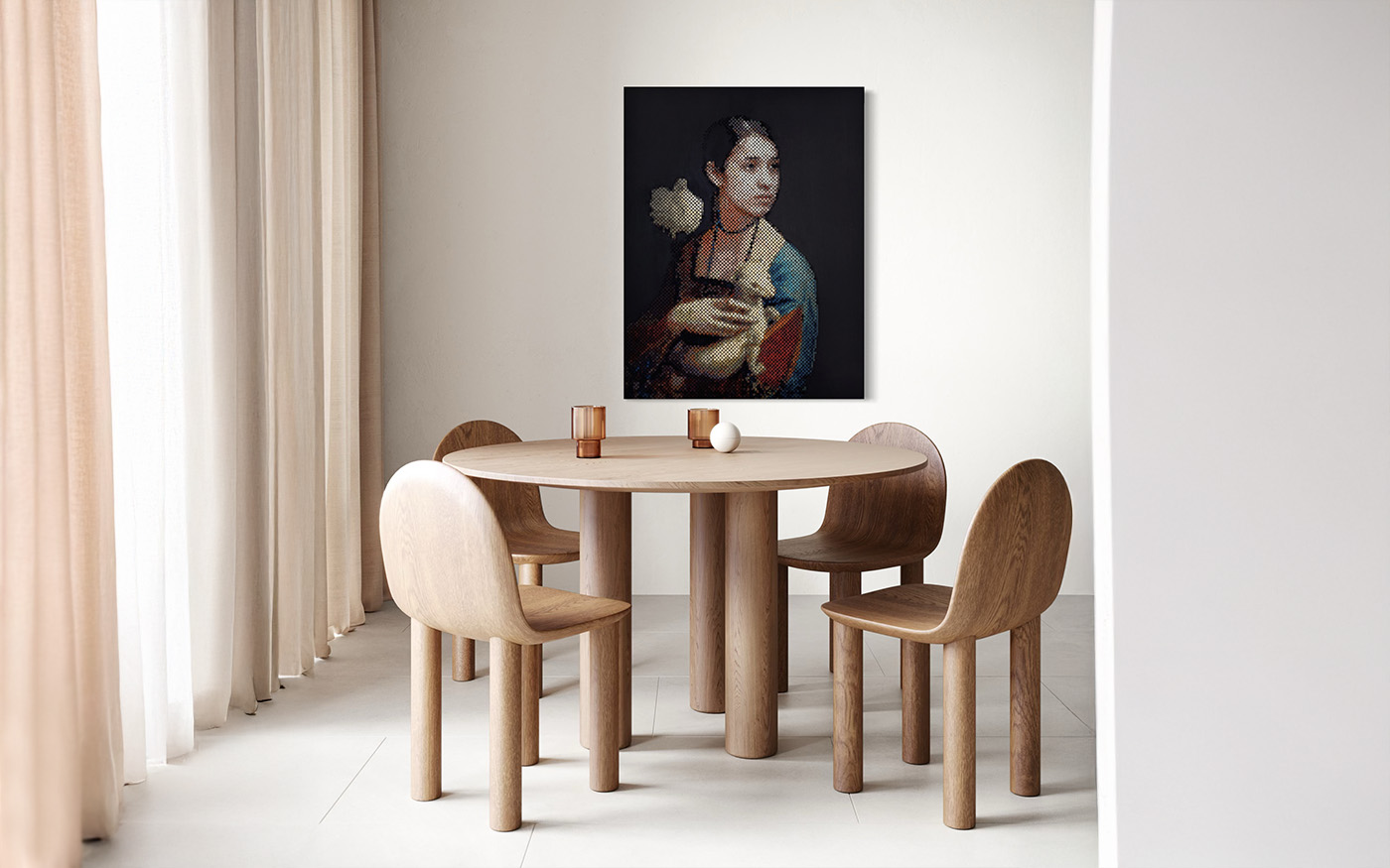 In shaping this piece, I turned to Leonardo da Vinci’s Lady with the Ermine. I dressed Nadia in the guise of that portrait, not as imitation, but as inversion. In da Vinci’s time, the ermine symbolized purity. Here, it becomes an act of restoration, a symbolic return of what was violently taken from her. The dove on her shoulder carries a similar weight, it is a messenger of peace, but also a reminder that her spirit, her inner purity, remained untouched by the violence done to her body. Her soul endured. And that endurance is rare and deeply human.
