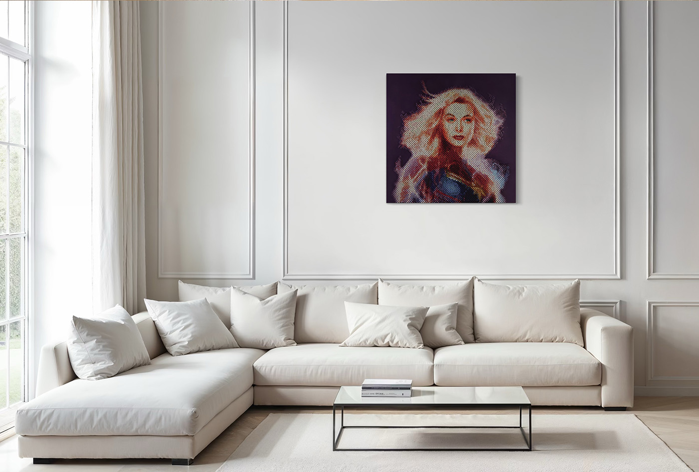 In this portrait, I chose to reimagine Lamarr not in the past, but in the realm of the heroic. I cast her as Captain Marvel, a modern icon of strength and wonder. The gesture is symbolic: while my earlier works placed living women into historical masterpieces, here I reversed the approach. Hedy, who is no longer with us, is projected forward—immortalized as a timeless figure, radiant not only in beauty but in intellect and innovation.